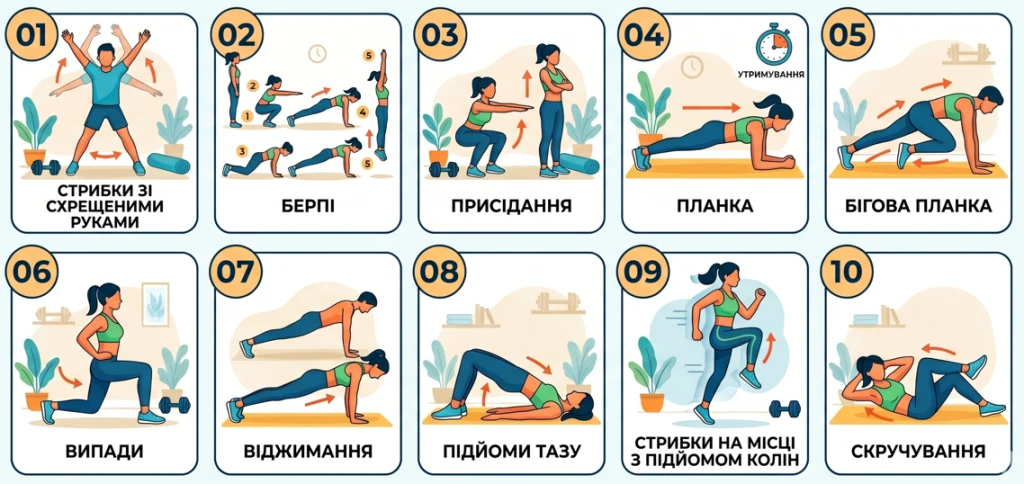| 02 | Берпі Все тіло 3×10 повт.~12 ккал/хв Королева домашніх вправ. Присідання — упор лежачи — віджимання — стрибок вгору. Спалює багато калорій за короткий час і тренує витривалість. Порада: якщо важко — прибирайте стрибок або віджимання на початку. |